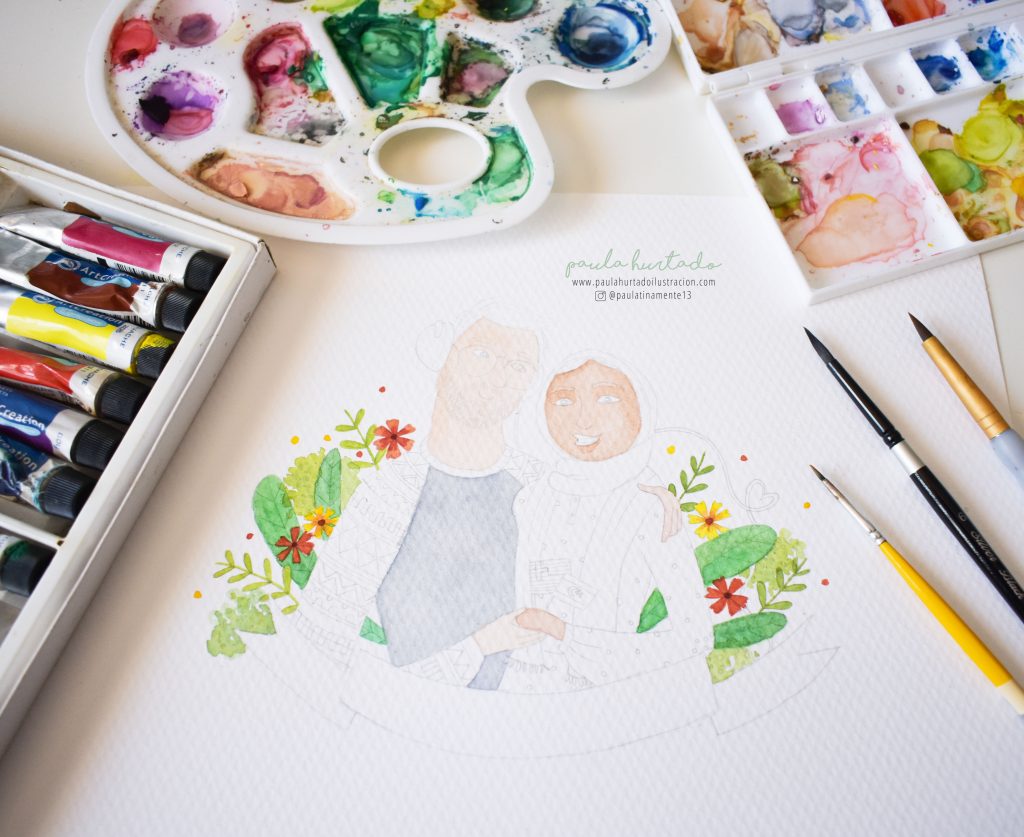 Para este retrato la técnica escogida fue la tradicional. Utilicé mis materiales favoritos que son los gouaches, acuarelas y lápices de colores para aportar detalles y texturas. En mi opinión no hay nada como un retrato pintado a mano, porque aporta muchísima calidez y le da un toque mucho más personal.
