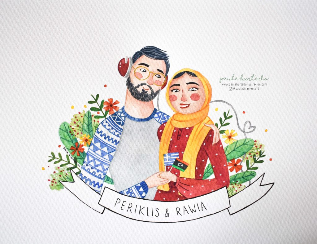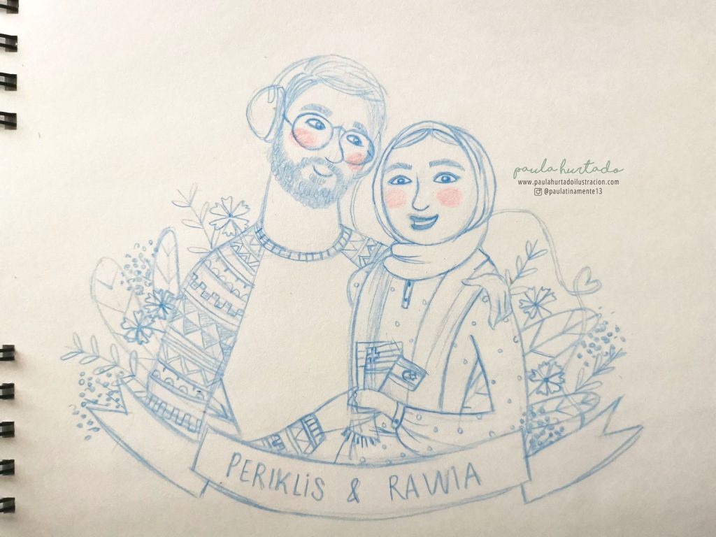 ¡Hola! hace un tiempo hice este precioso retrato pintado a mano de Rawia y Periklis, un regalo de boda de Cristina, la tía de Periklis y que ya me había encargado una ilustración personalizada muy especial, el retrato de Despoina, su pequeña hija.